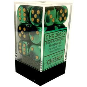 Diceblock - 12 16mm D6 - Gemini Black-Green with Gold (CHX26639)